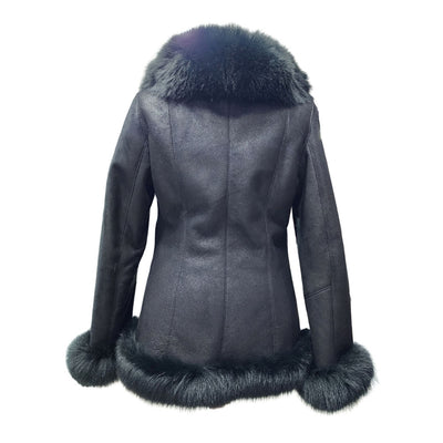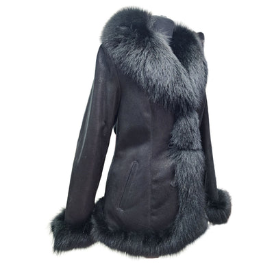 This fall season, come out with the look that will give you an entirely different chic look that can make your appearance iconic by wearing Astrid black shearling coat with fox fur trim. Manufactured with 100% fine Spanish merino double-faced sheepskin shearling which makes it warm and ageless and its 100% sheepskin shearling inner will comfy you as long as you wear it. The strong black color is enough to increase the charm of your persona. The Astrid black shearling coat has been styled by using features like a Real Fox Fur on collar lapels, zipper closure, and open hem fur trim cuffs. Now win the hearts of your friends and people around you through your chic style just by wearing this Women's Shearling Coat.