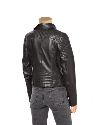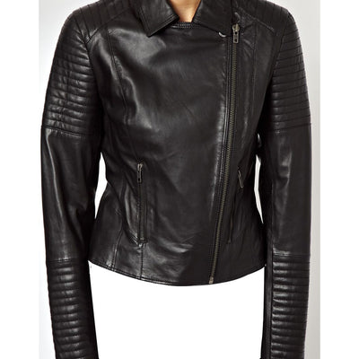 Get ready to show off your attractive biker looks by wearing this exemplary Women's black biker style leather jacket with ribbed panels outwear. Never underestimate the characteristics of a black biker style leather jacket. Manufactured from full-grain leather. Moreover, its Inner satin polyester lining will introduce you to an exemplary comfort level. For a true biker style, this jacket comes in unique Blackish color. Its notch lapel collar style along with Front Zipper Fastening makes this jacket one of the best and most fashionable biker-styled outwear in the market. To make it more captivating, this jacket features a ravishing quilted pattern to give it a luxurious feel.